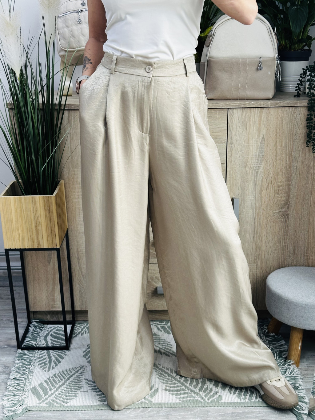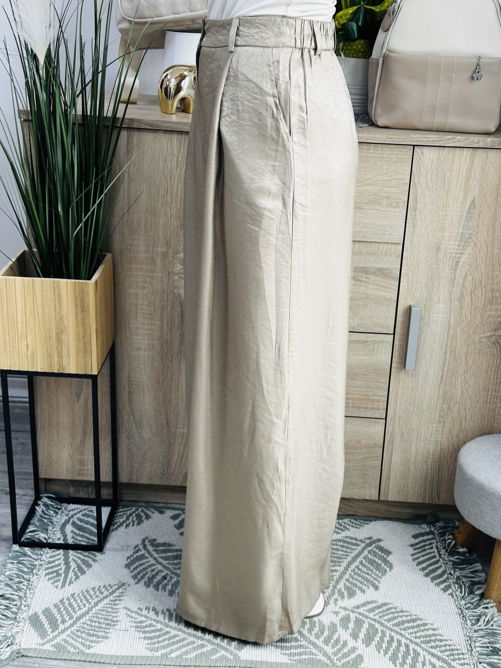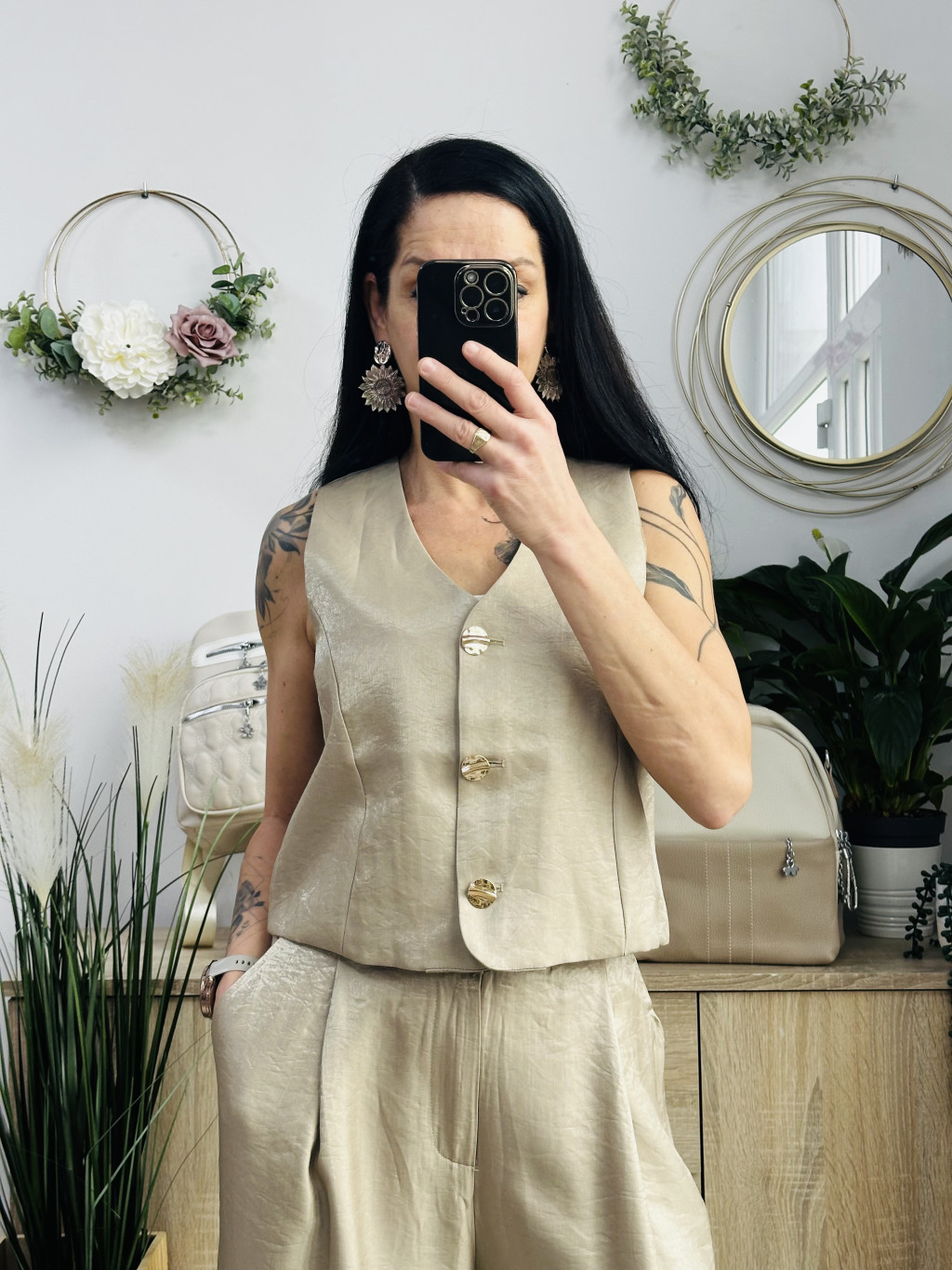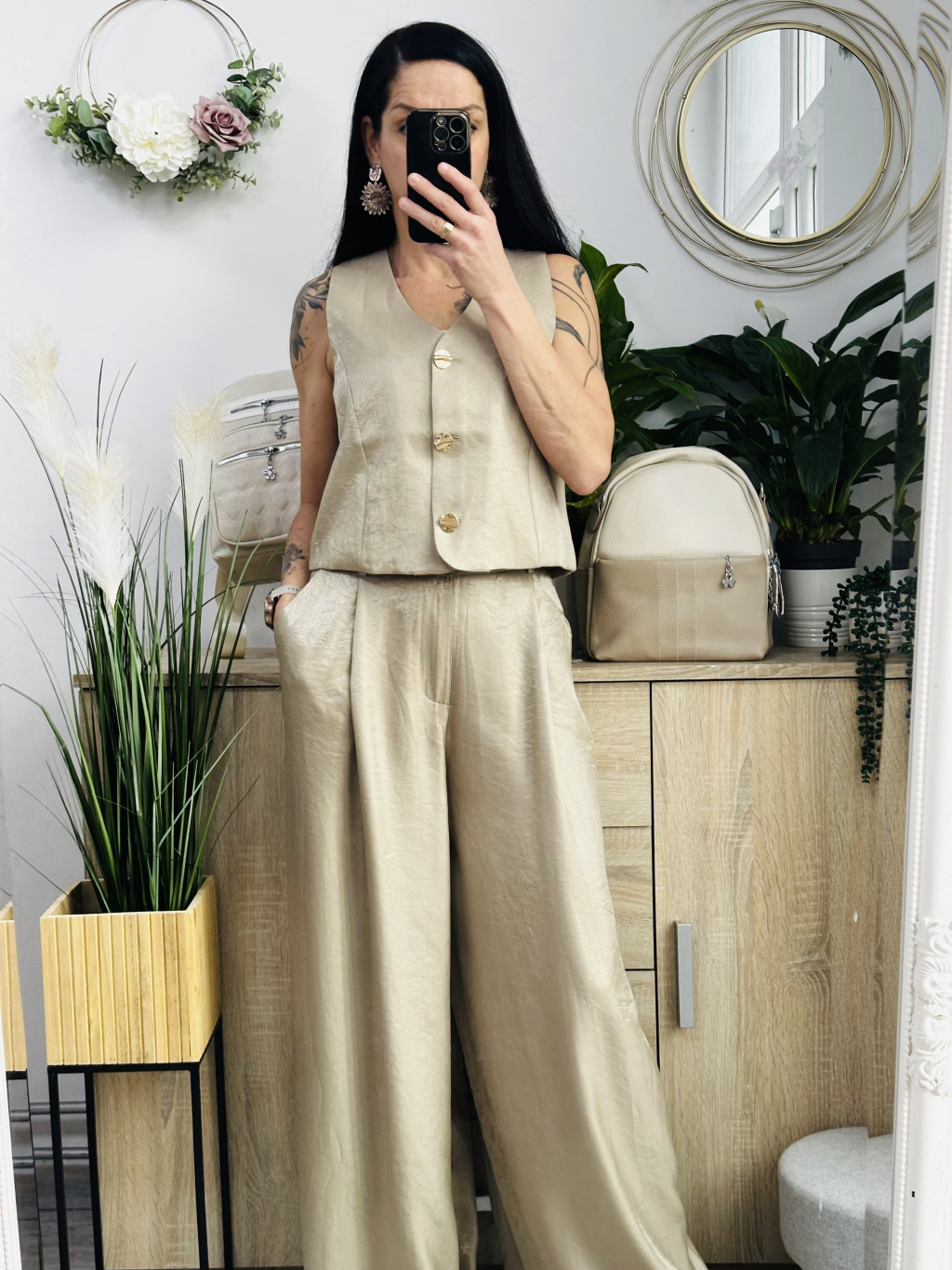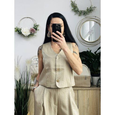 Roma mellényes szett. Elegáns, fényes anyagból készült, igazán különleges együttes. Méretezett modell. A nadrág gumis derekúés bő lábszárú. A mellényt arany gombok díszítik. Vastag barna műbőr övvel együtt szállítjuk. A mellény önmagában is hordható.