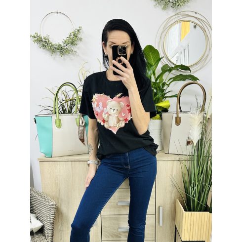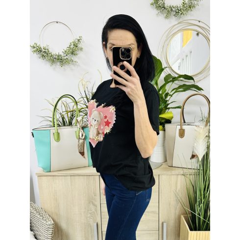 Agapé macis pamut póló. Méret nélküli nagyobb fazonú póló. Elől macis nyomott mintával és gyöngy díszítéssel.