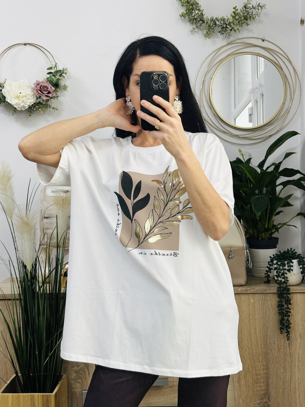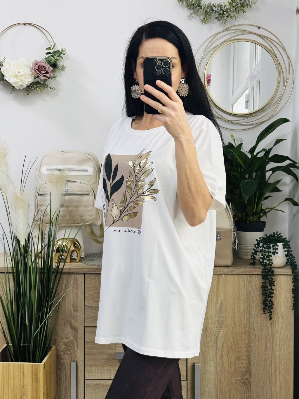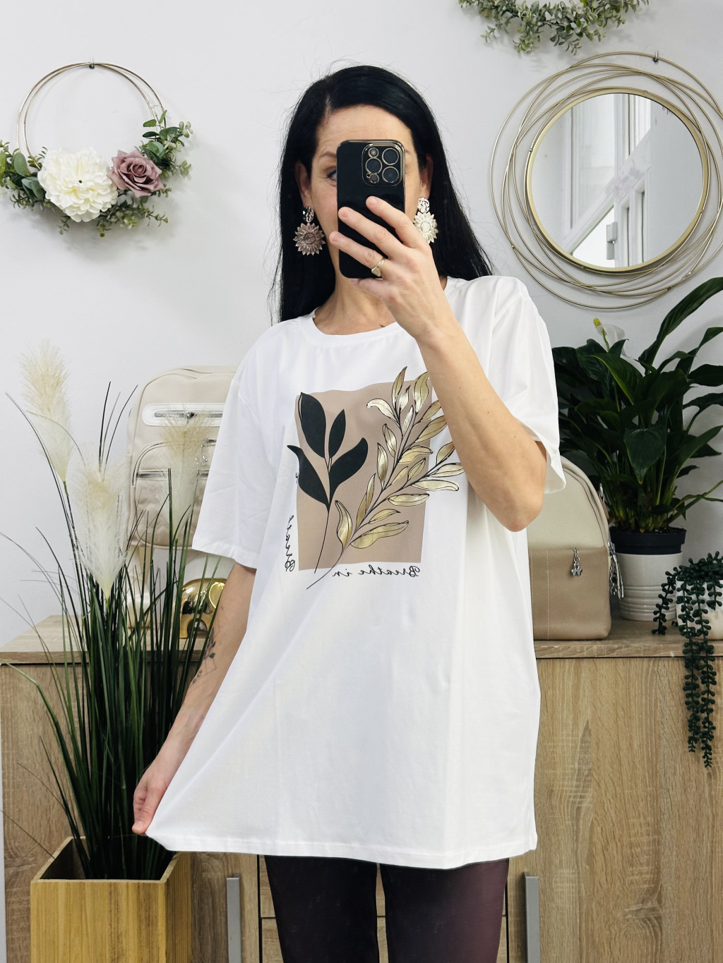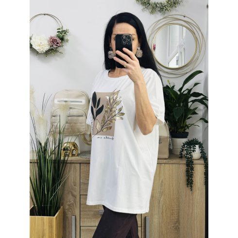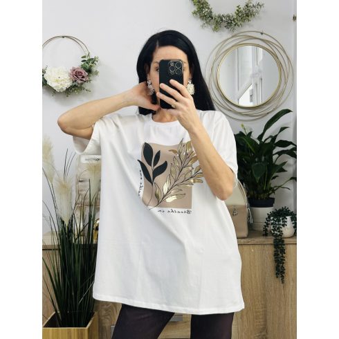 Kamilla nagyméretű felső. Méret nélküli modell. Elől levél nyomattal. Rövid ujjú modell.