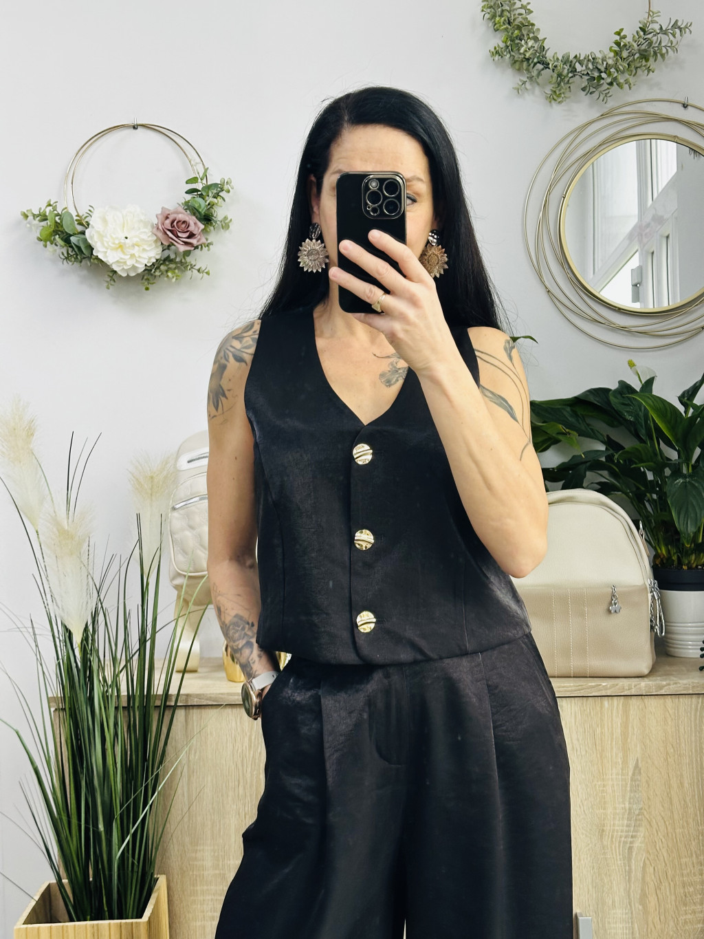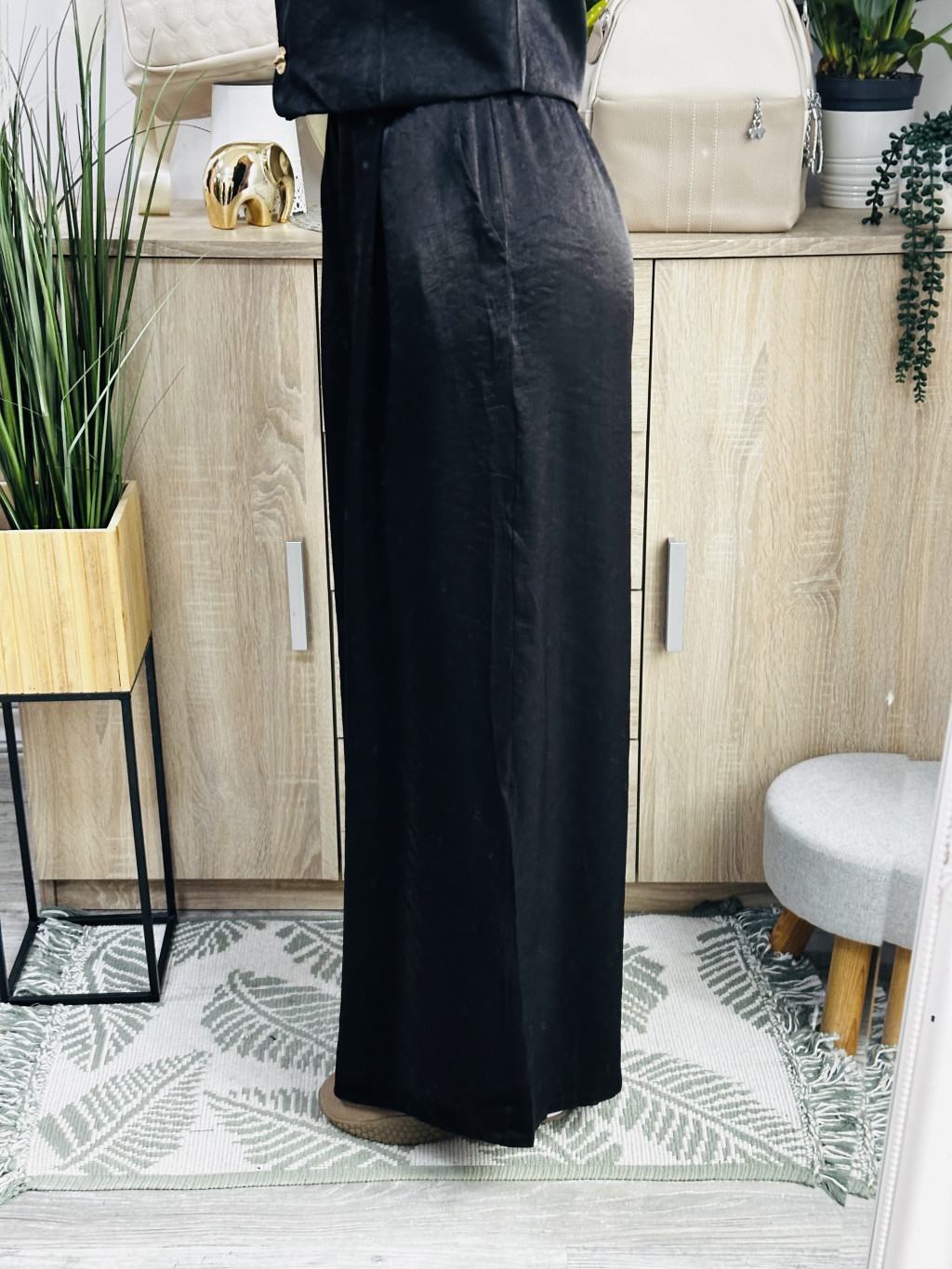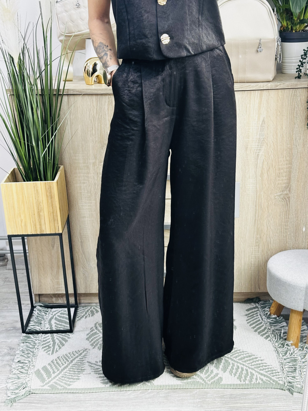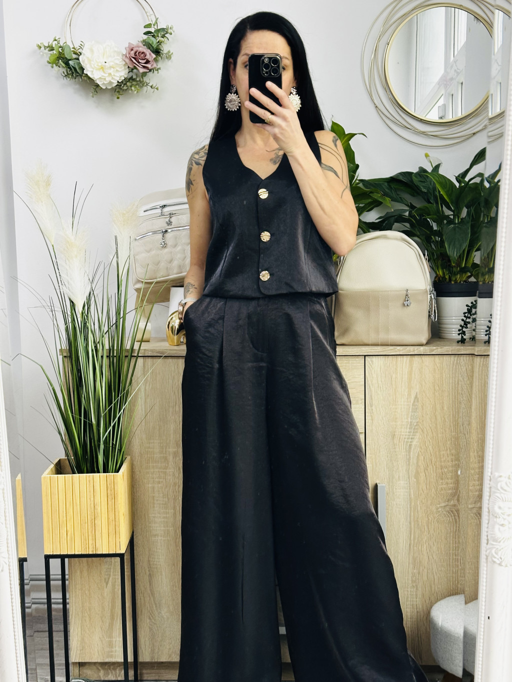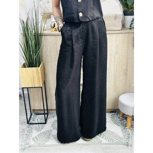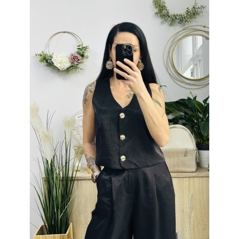 Roma mellényes szett. Elegáns, fényes anyagból készült, igazán különleges együttes. Méretezett modell. A nadrág gumis derekúés bő lábszárú. A mellényt arany gombok díszítik. Vastag barna műbőr övvel együtt szállítjuk. A mellény önmagában is hordható.