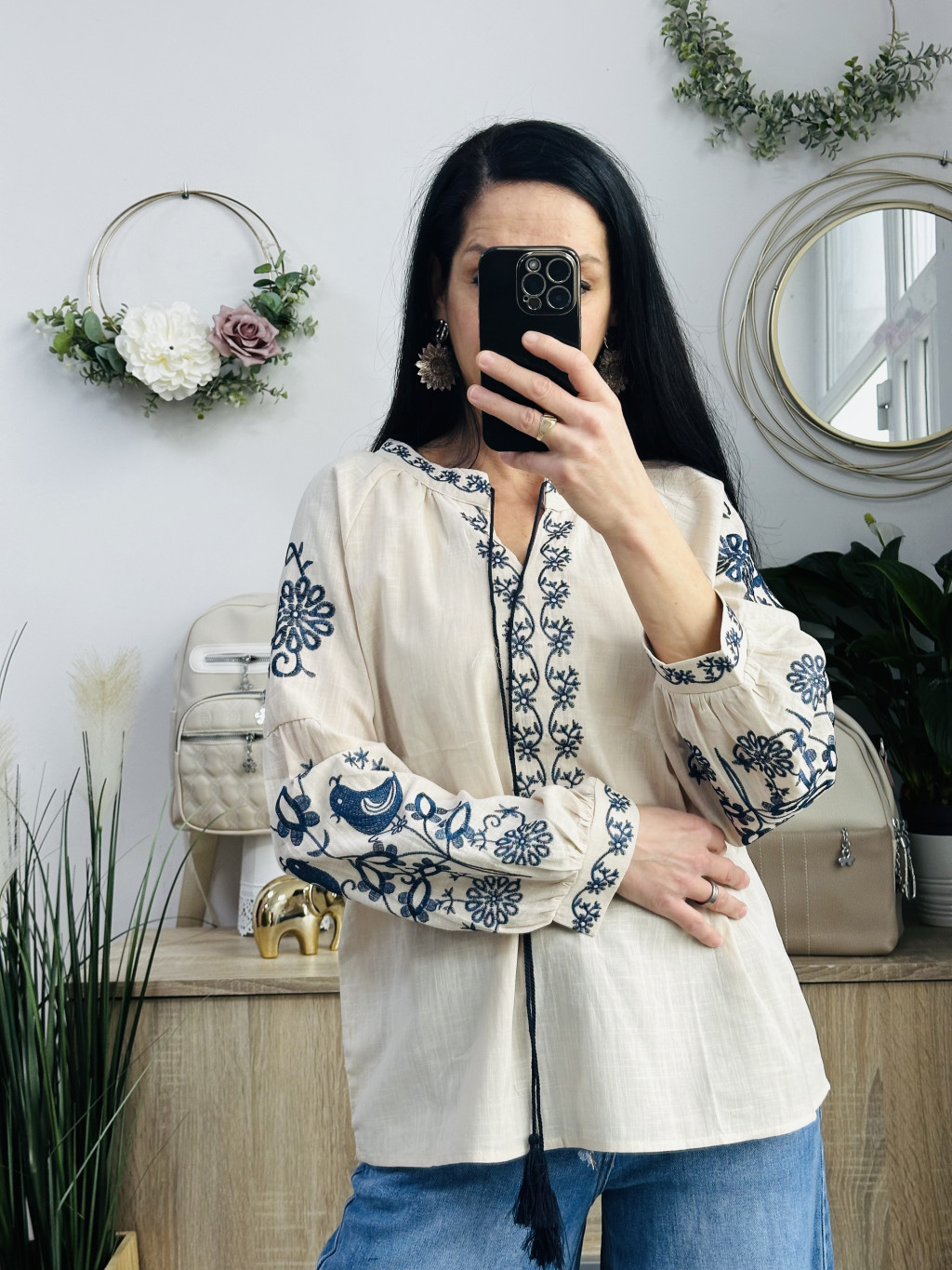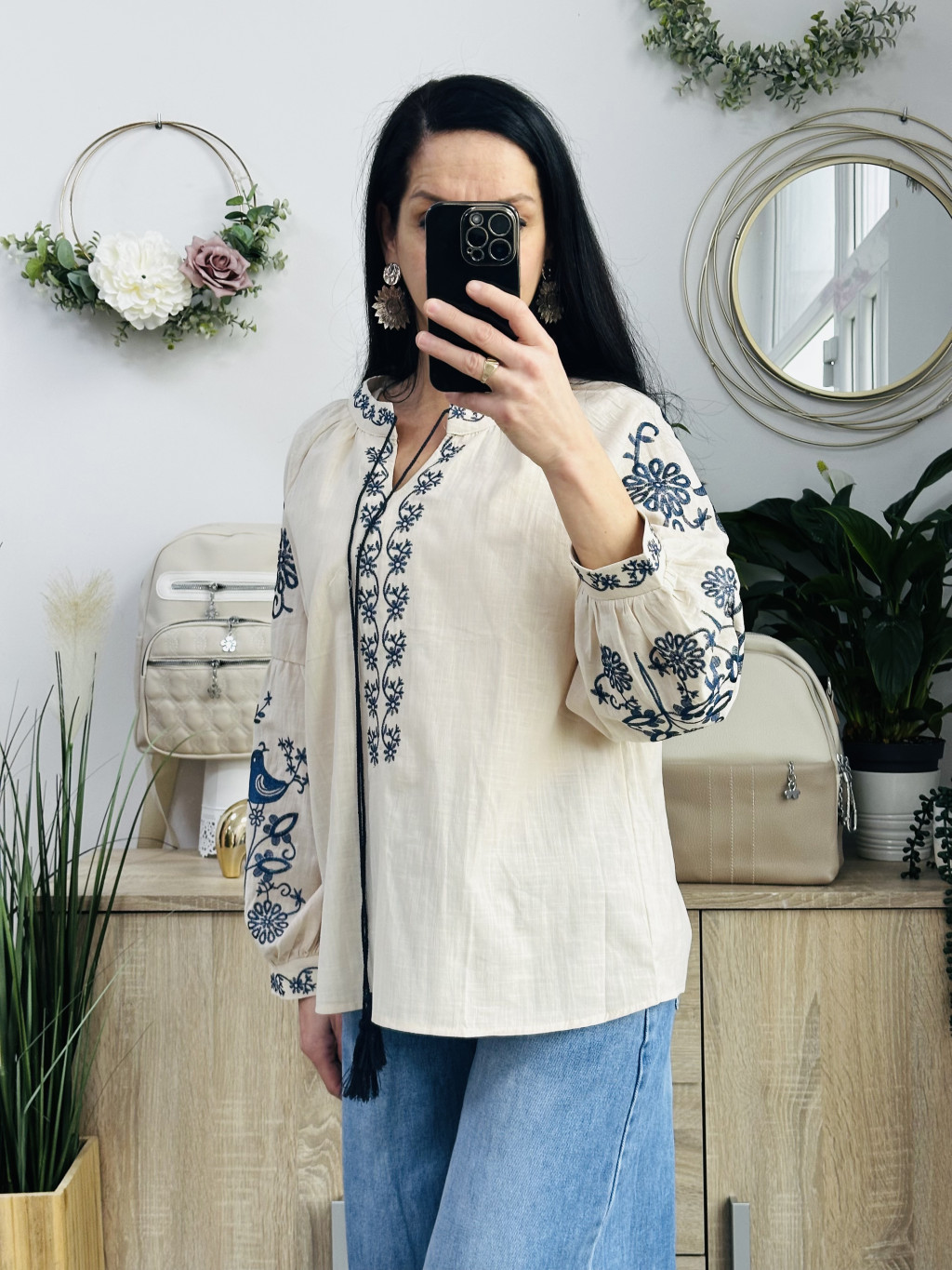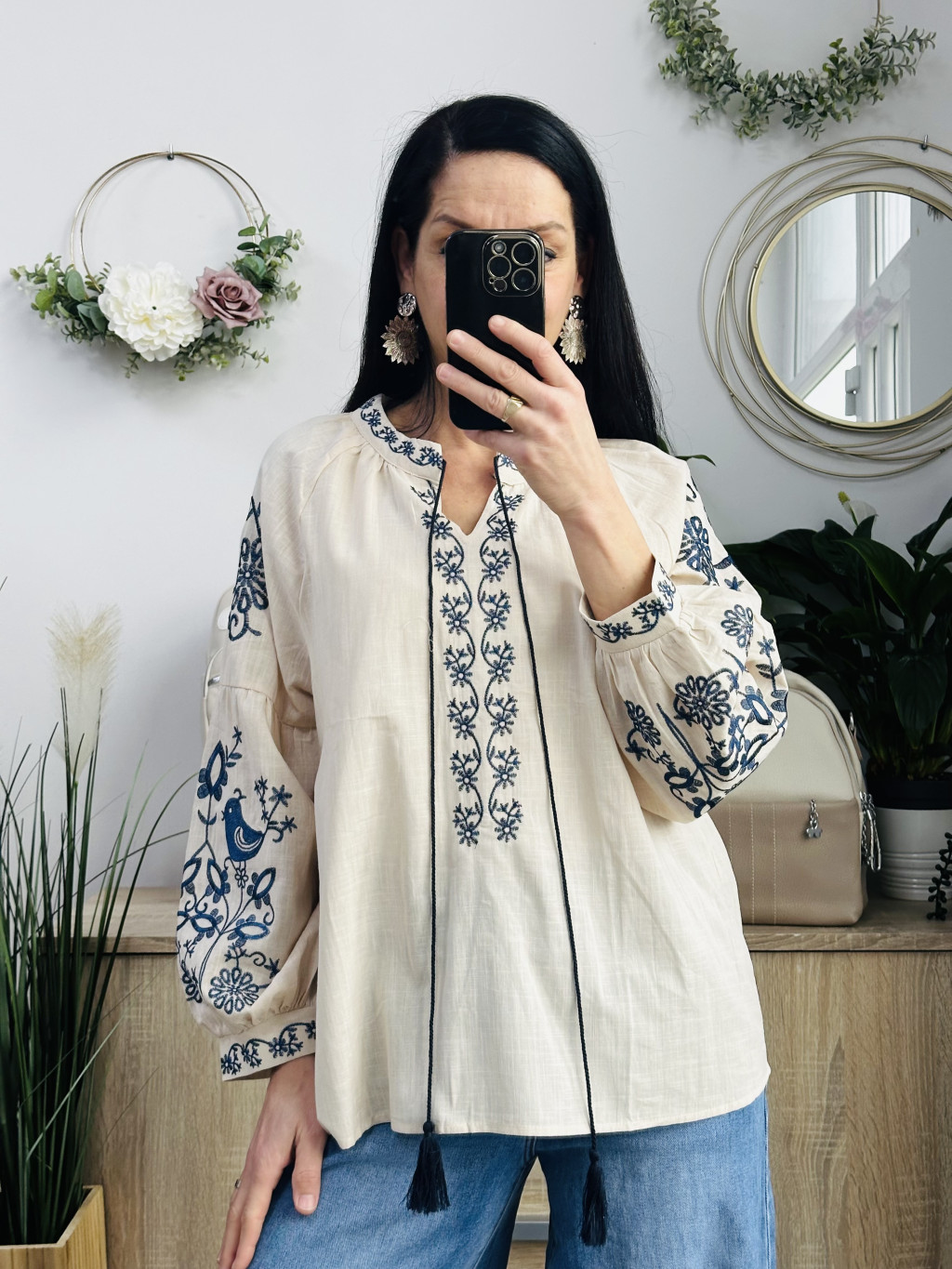 CCG hímzett madaras felső. Méretezett modell, de mindkettő méret azonos! V nyakkivágással és zsinór díszítéssel.