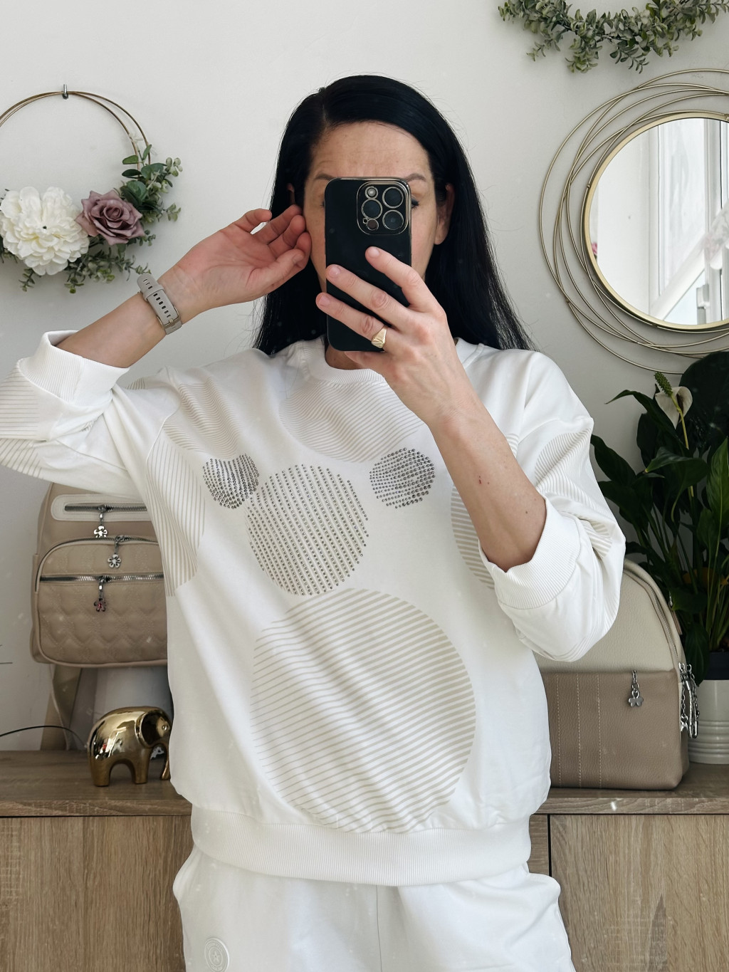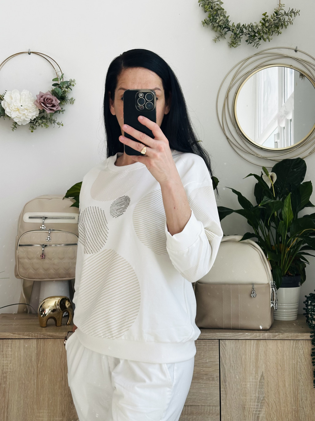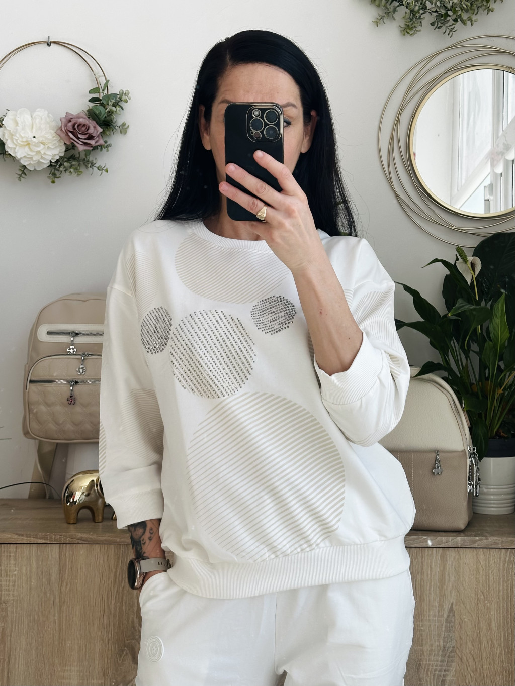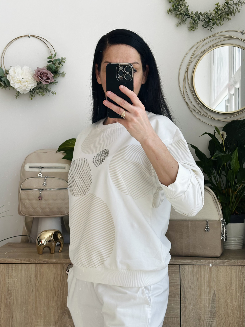 Megi körös felső. Méretezett modell. Kör nyakkivágással, 3/4-s ujjal. Kiváló minőségű lengyel felső. Elérhető méret: S/M