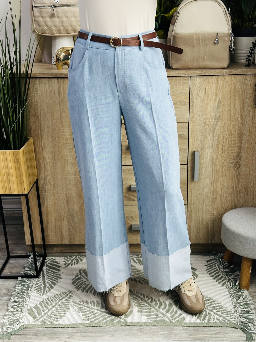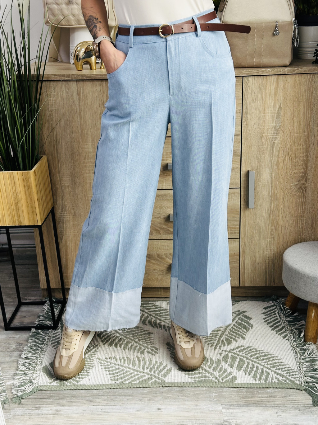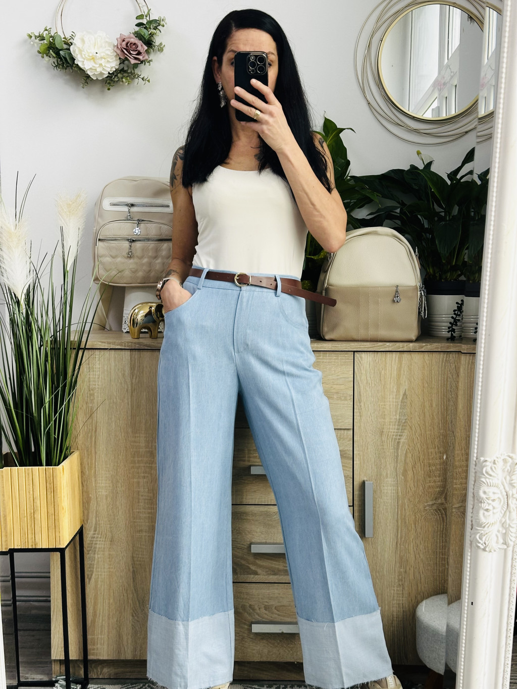 Love Passion farmernadrág, vékony puha anyagból. Egyenes bő lábszárral, alul világosabb anyaggal kombinálva.