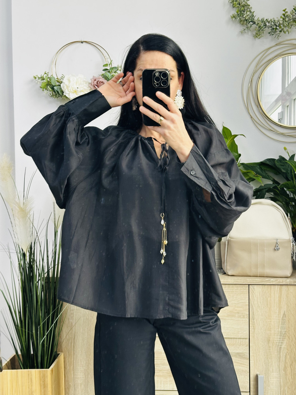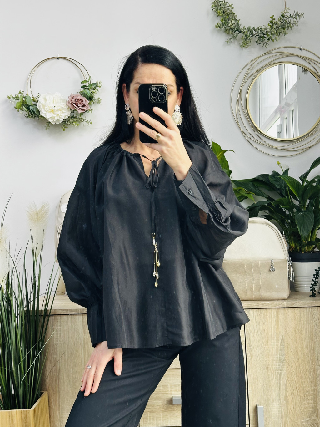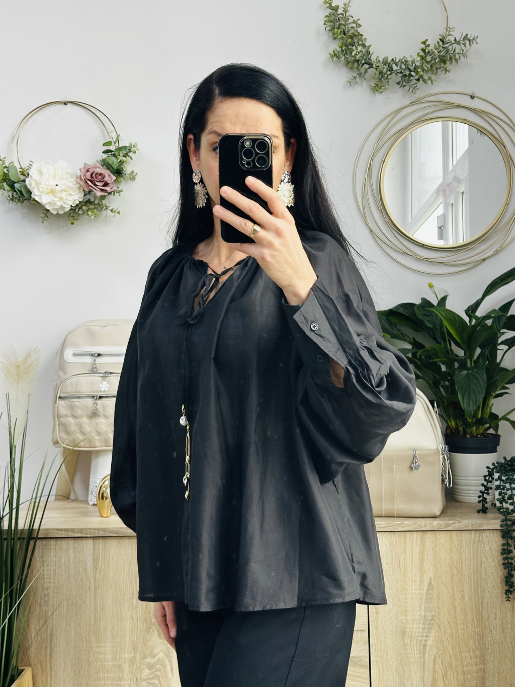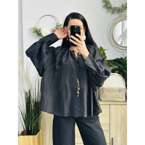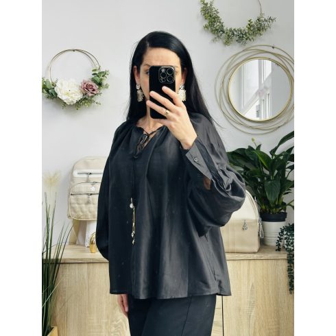 Manosque pille vékony felső. Elegáns méret nélküli blúz, buggyos ujjal és lánc díszítéssel a kötő végén. Ha bátrabb vagy csak melltartóval, ha szolidan szeretnéd egy trikóval ajánljuk.